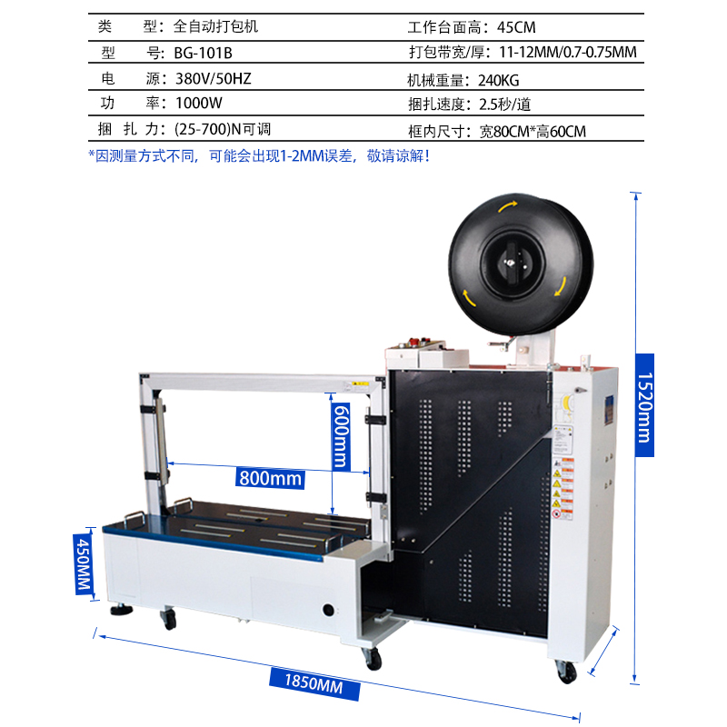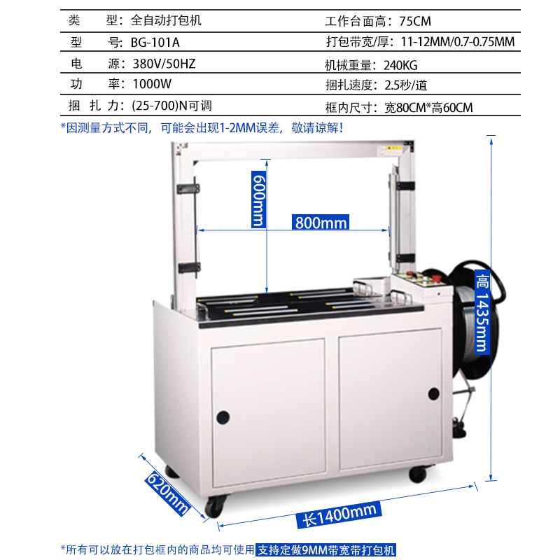 - 尺寸與形狀:如果物品尺寸較大、形狀不規(guī)則,需要選擇弓架尺寸大的打包機(jī),如家電、家具等行業(yè),可能需要弓架寬度 800mm 以上、高度 600mm 以上的機(jī)型;對于小型物品,如快遞包裹、小型電子產(chǎn)品等,可選弓架尺寸較小的,如寬度 400-600mm、高度 300-400mm 的機(jī)型,方便精準(zhǔn)打包且設(shè)備占地小。