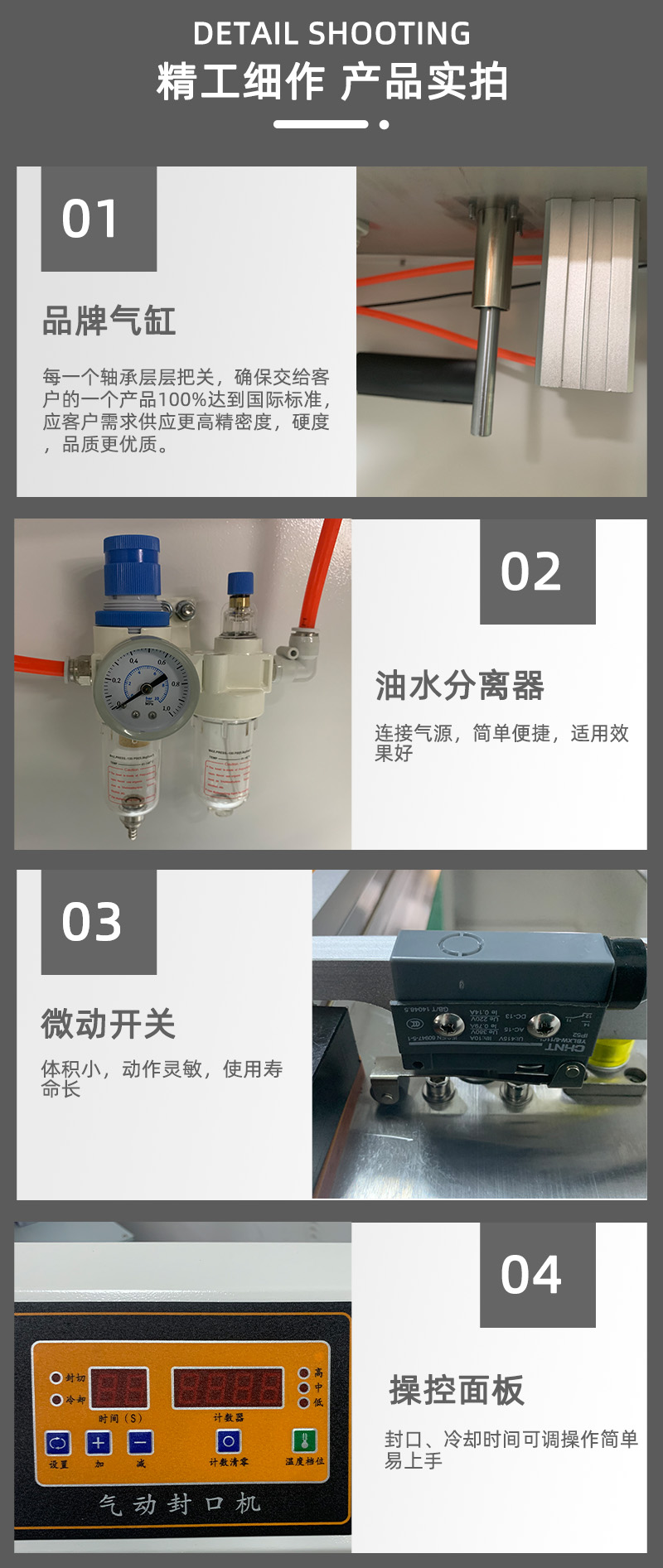 • 氣動系統的工作介質是空氣,空氣具有可壓縮性和流動性,這使得氣缸能夠快速響應控制信號。當需要進行封口操作時,氣動控制系統可以迅速將壓縮空氣輸送到氣缸,推動活塞運動,使封口壓頭快速下壓,實現對包裝袋的快速壓緊。相比之下,一些采用機械傳動或液壓傳動的封口機,由于機械結構的慣性、液壓油的流動特性等因素,在響應速度上可能會較慢。