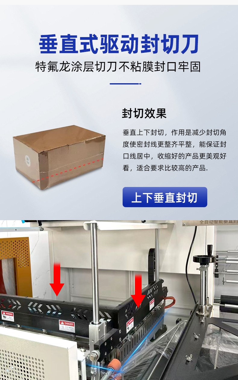 全自動垂直封切機采用上下垂直驅動封切結構,摒棄了傳統 L 型封切機的水平推拉式封切方式,轉而通過上下對稱的驅動模組帶動封切刀同步運動,使封切刀與薄膜的接觸面實現全方位均勻受力