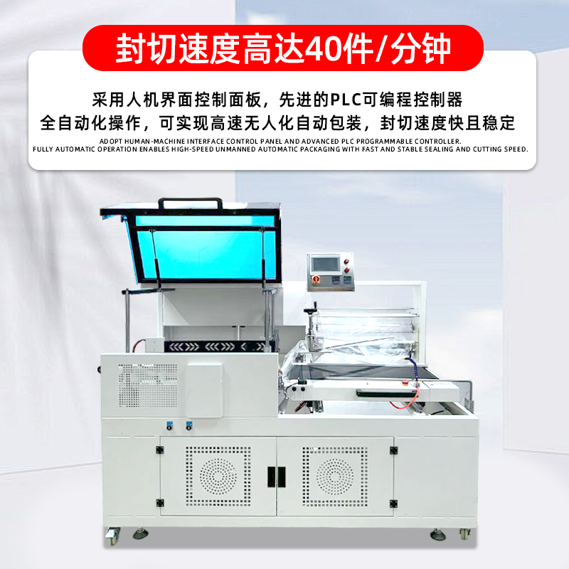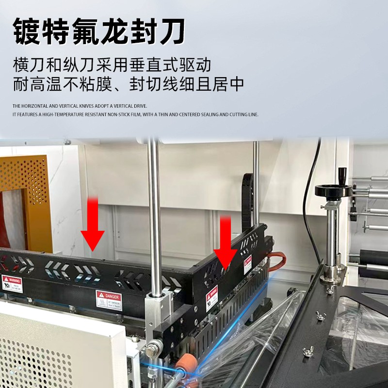 在工作過程中,當薄膜套裹產品到位后,上下兩組封切刀會沿垂直方向精準閉合,壓力從頂部和底部同時作用于薄膜封口處,且壓力值可通過控制系統精準調節,確保封口區域的每一個點位受力大小一致。這種受力模式從根源上解決了傳統 L 型封切機的技術痛點: