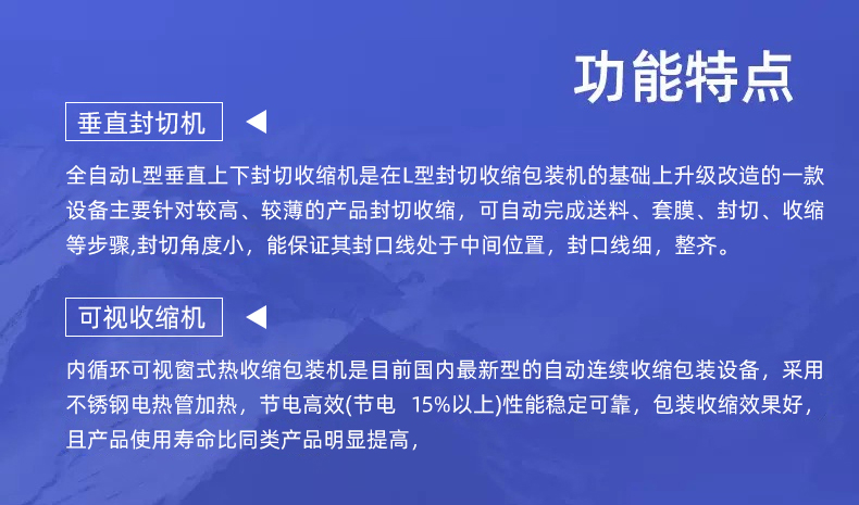 全自動垂直封切熱收縮包裝機憑借高效自動化、封口平整、適用范圍廣的特點,適配多行業的產品包裝需求,尤其適合需要批量包裝、追求外觀整潔或需防潮防塵防護的物品。垂直封切上下驅動,封口均勻無折皺,適合高度方向尺寸大的產品;L 型封切效率更高,適合扁平小件批量包裝。