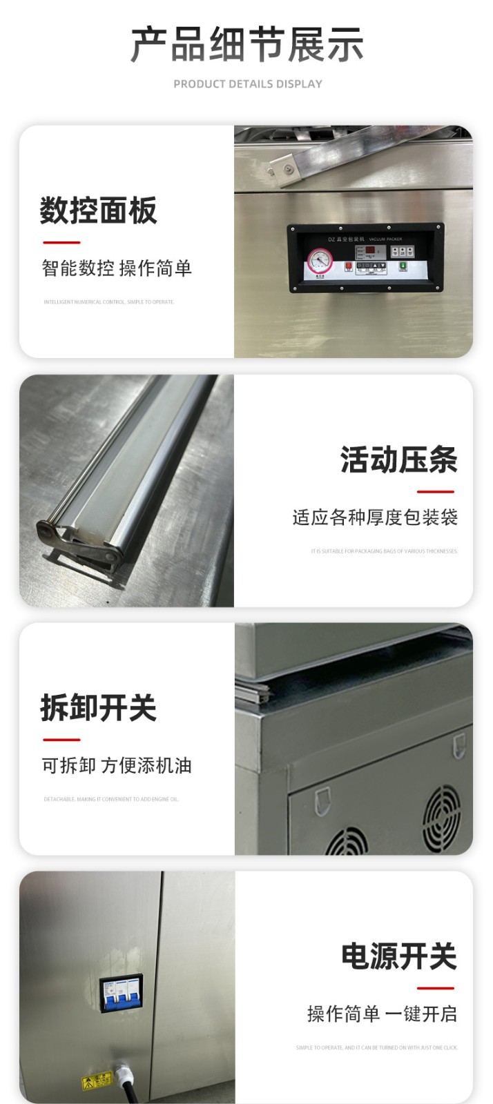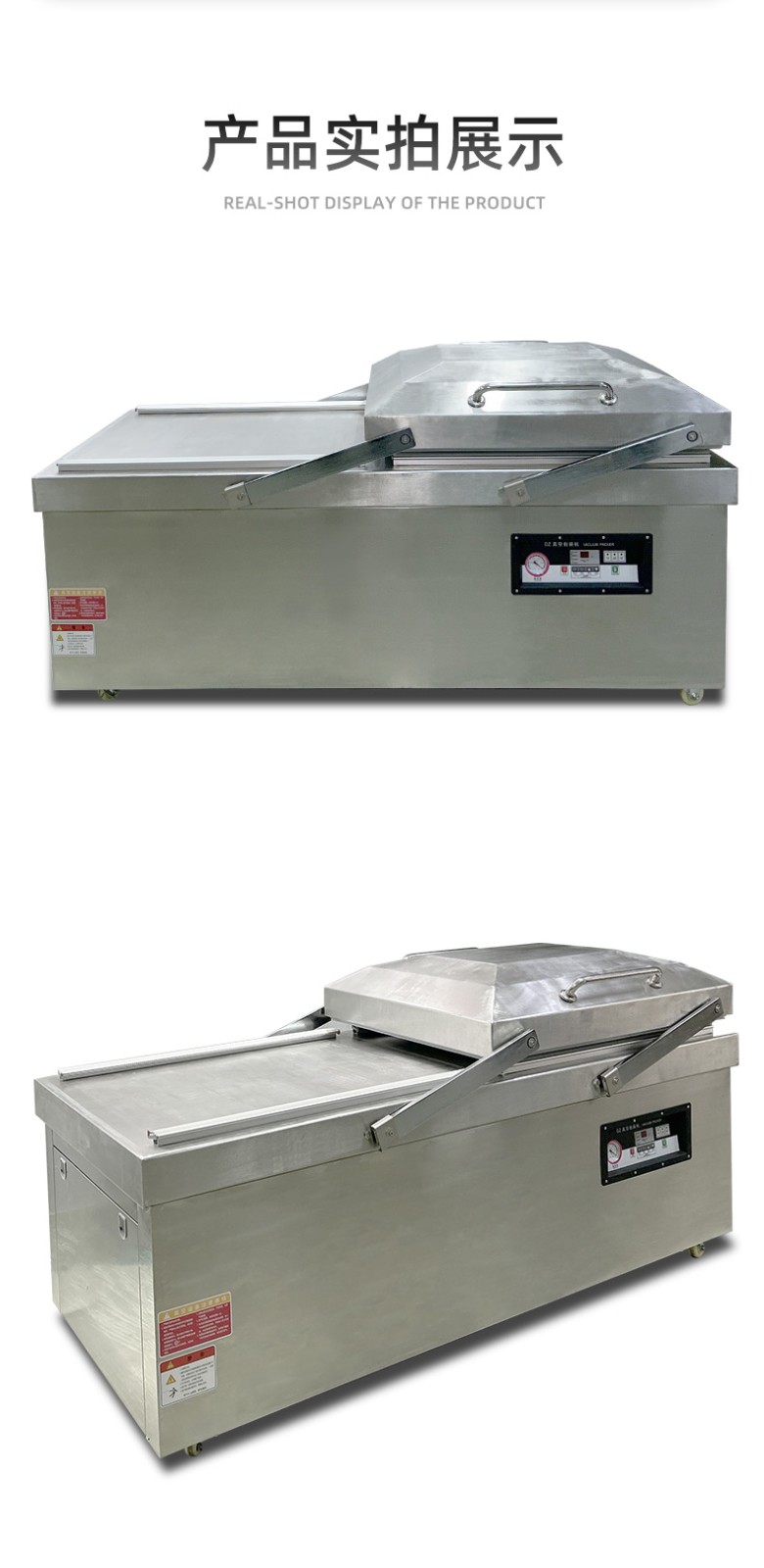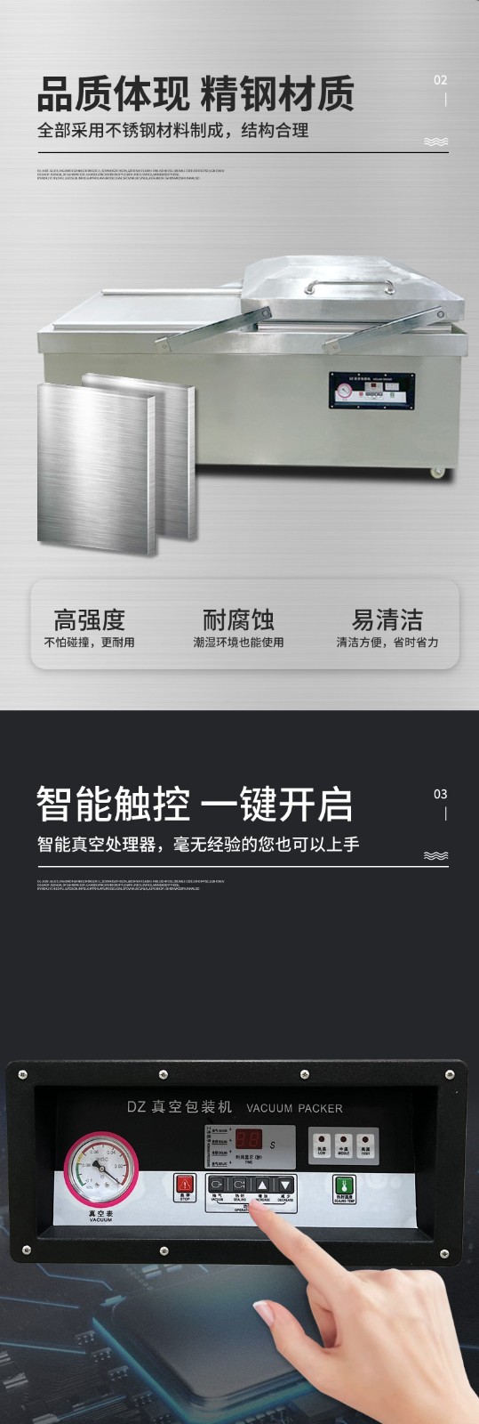 - 真空室:通常由不銹鋼制成,具有兩個對稱的工作室,可同時進行真空包裝操作,提高工作效率。工作室底部為平板狀,便于放置包裝物品,且易于清潔。