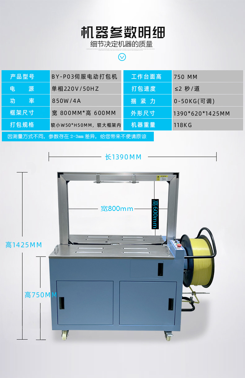 - 全自動伺服打包機通常具有簡潔、緊湊的外觀設計,整體結構堅固耐用。其機身主要由框架、工作臺、輸送帶、控制箱等部分組成。框架一般采用優質金屬材料制成,經過精細加工和表面處理,具有良好的穩定性和耐腐蝕性。工作臺位于機器的中央位置,是放置待打包物品的區域,表面平整光滑,便于物品的放置和移動。輸送帶貫穿整個機器,用于輸送物品進出打包區域,其寬度和長度根據不同的機型有所差異,以適應各種尺寸的物品打包。控制箱通常安裝在機器的一側,集成了操作面板和控制系統,方便操作人員進行參數設置和對機器的運行進行監控。