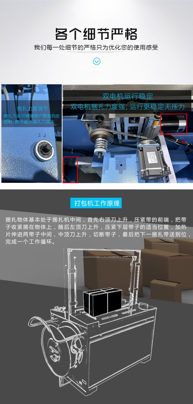 - 自動上帶:機器啟動后,會自動從打包帶卷中抽出打包帶,并將其傳送到預定的位置,準備進行打包。這個過程無需人工干預,大大提高了工作效率。